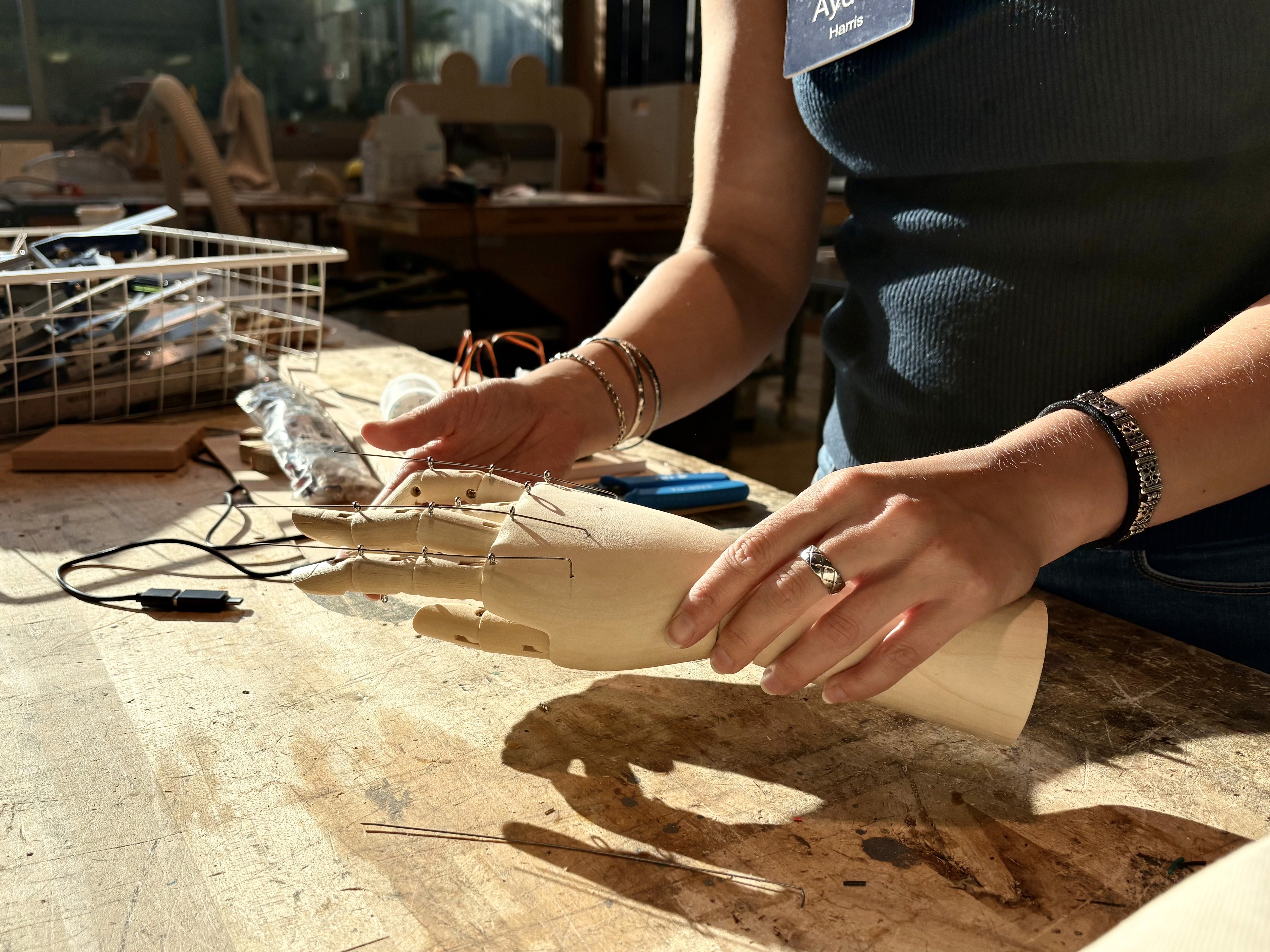 I iterated through low-fidelity prototypes, switched directions quickly when an approach didn’t work, and problem-solved in real time. The final design used a combination of servos pulling illusion wire on the tips of fingers, while music wire affixed to the backs of the fingers straightened them. This rapid, hands-on process forced me to make intentional material choices and adapt my ideas on the fly to achieve a working interaction.